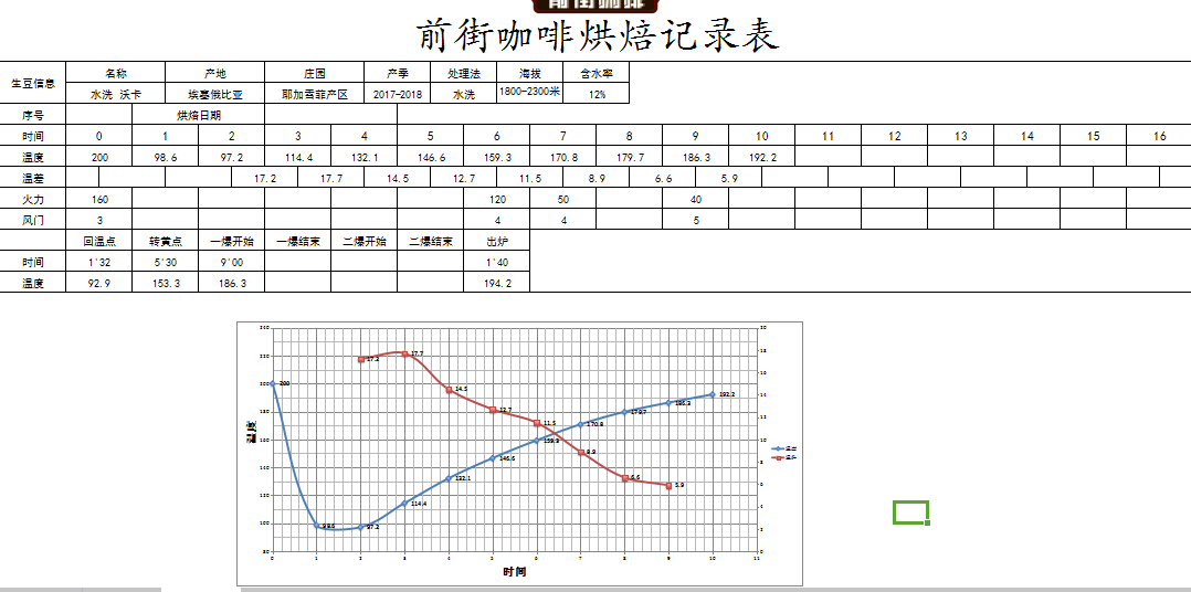 Preheat the roaster to 200°C, set air damper to 3, start fire after 30 seconds, adjust heat to 160, return temperature point at 1:32, turn yellow at 5:30 seconds, grassy aroma disappears, enter dehydration stage, reduce heat to 120, open air damper to 4, reduce heat to 50 again when reaching 170°C.