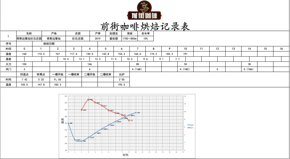 This bean belongs to SHB (Strictly Hard Bean) category, with hard bean texture and medium moisture content. Yellowing point at 5'25", entering first crack at 9 minutes. Development for 2 minutes after first crack before discharge. Enter drum at 160°C, heat power 100, damper setting 3; return temperature at 1'42", when drum temperature reaches 146°C, open damper to 4, heat unchanged; when drum temperature reaches 153.6°C, bean surface turns yellow, grassy aroma completely disappears, entering dehydration stage. When drum temperature reaches 168°C, adjust heat to 80°C, damper at 4; at 8'09", ugly wrinkles and black spots appear on bean surface, toast aroma clearly transforms to coffee aroma, which can be defined as the prelude to first crack. At this time, listen carefully for the sound of first crack. Starting first crack at 9'00", damper unchanged, develop for 2 minutes after first crack, discharge at 195.5°C.