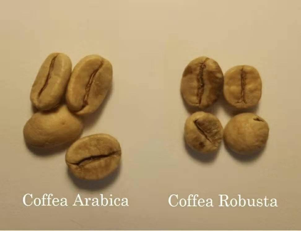 Robusta coffee beans are one bean per fruit. Robusta beans are relatively round and C-shaped; the central line appears as a "1" shape, and the raw beans display a yellowish-brown color.