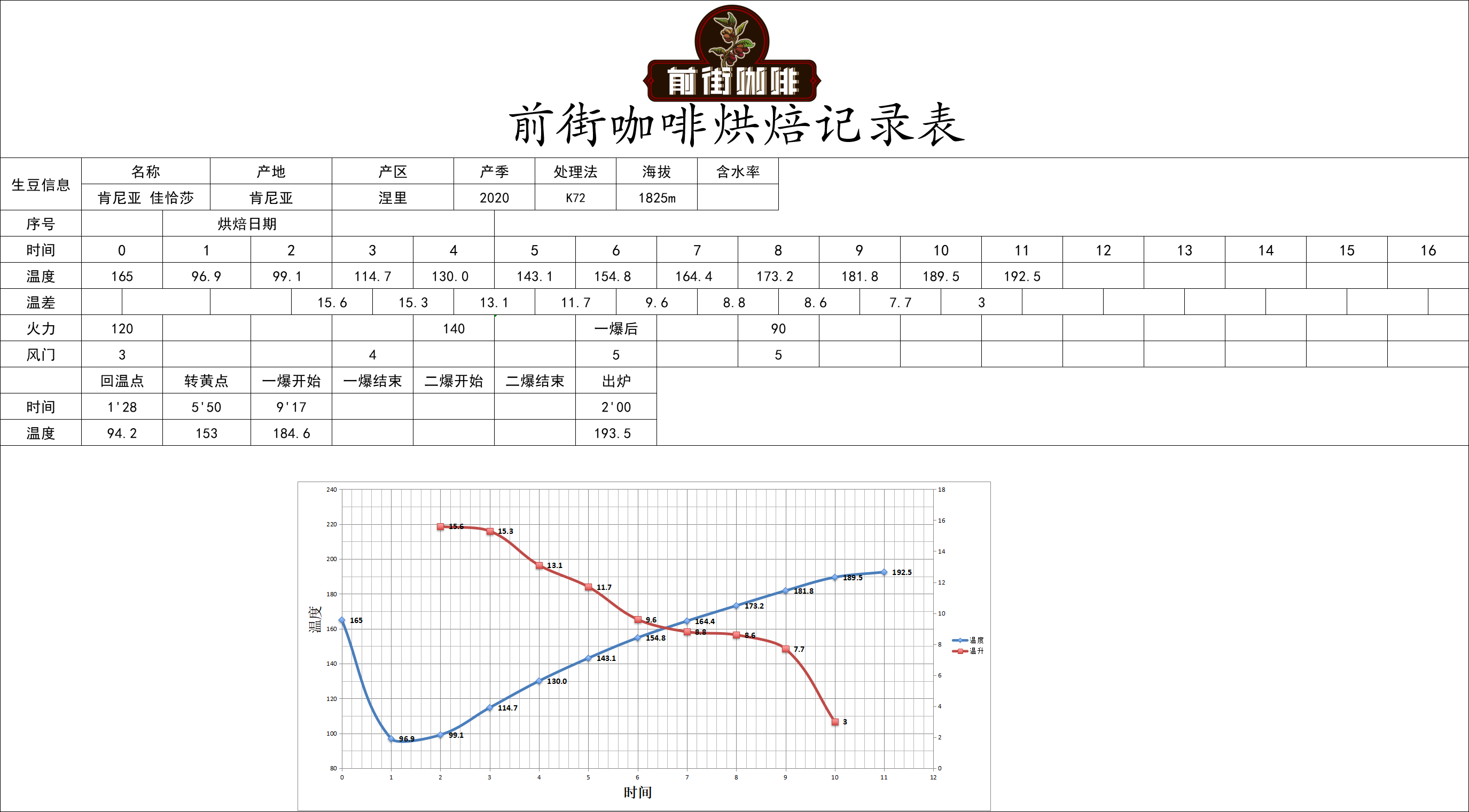 These Frontsteet Kenya Cherry Tomato beans are full and round. To fully express their bright and rich acidity, FrontStreet Coffee uses a light roast. Yangjia 800N semi-direct fire, with 480g beans: Set drum temperature to 160°C when loading beans, damper at 3, heat at 120. Return temperature point: 1'28". When temperature reaches 130°C, set damper to 4. Roast to 6'00", temperature 154.6°C, bean surface turns yellow, grassy smell completely disappears, dehydration complete.