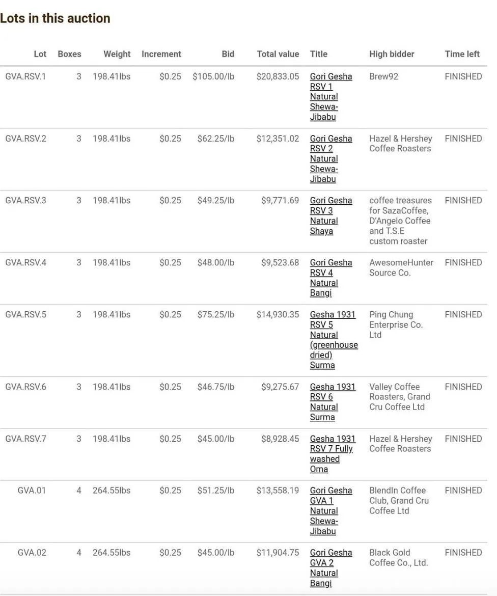 In the auction batches, the proportion of the three coffee varieties at Gesha Village was: Gesha 1931 accounting for 69.1%, Gori Gesha accounting for 27.5%, and Illubabor accounting for 3.4%.