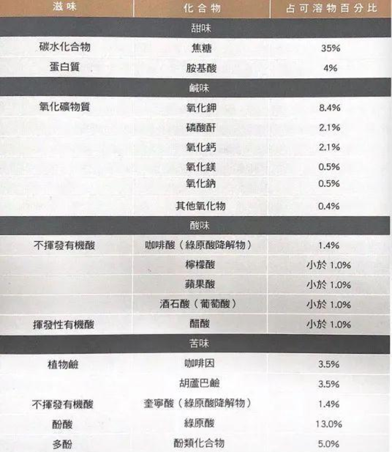 The above data shows the weight proportion of soluble taste compounds in roasted coffee beans: sour, sweet, bitter, and salty. Although sweet components are the most abundant, accounting for 39% of soluble compounds, followed by bitter compounds at 26.4%, salty ranks third at 14%, and sour has the lowest proportion at no more than 5.4%, totaling 84.8%. The rest not listed should be taste compounds with lower content. Don't think that just because the sweet proportion is so high, coffee will be as sweet as honey. This is not the case. The bitterness, acidity, or saltiness of black coffee can easily interfere with the original sweetness. The four tastes have complex relationships of mutual cancellation and complementarity.