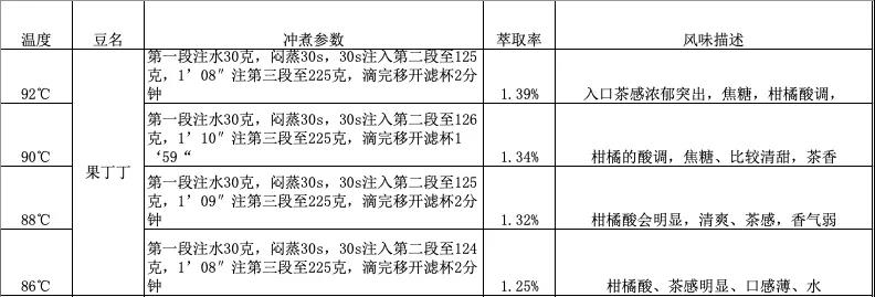 Through the brewing data, we can see that the light-roasted FrontStreet Coffee Gedeb is quite suitable for brewing with 90-92°C water temperature, which can present fruit acidity and sweetness, matching the flavor of FrontStreet Coffee Gedeb. Using 86-88°C water temperature, one can clearly perceive that the bean's acidity is prominent but lacks aroma, with thin, watery mouthfeel.