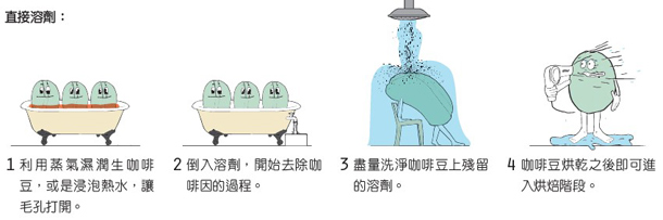 Initially, the direct solvent method used dichloromethane solvent to directly contact coffee beans. The direct solvent method is also known as natural decaffeination processing. First, steam is used to open the pores of the green coffee beans, then dichloromethane solvent is added directly to the coffee beans. After the solvent combines with the caffeine, the caffeine-filled solvent is washed away, and the coffee beans are steamed again to remove all residual solvent. The boiling point of dichloromethane is 39.8 degrees Celsius, so even if solvent remains during the steaming process, it will completely evaporate after roasting.