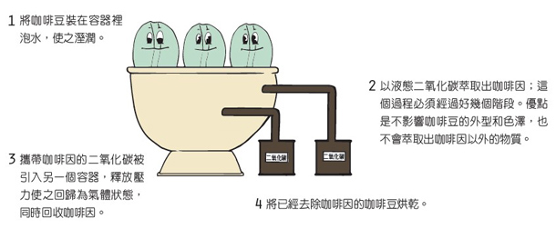 This processing method first allows coffee beans to absorb water and expand, with caffeine molecules in a loose state within the coffee beans. Liquefied carbon dioxide is added and creates pressure greater than 100 atmospheres in water. Carbon dioxide is highly selective, dissolving caffeine without "harming" the carbohydrates and proteins in the coffee beans, ensuring that the coffee bean's flavor is not damaged. The liquid carbon dioxide that carries away the caffeine can be reused after removing the caffeine.