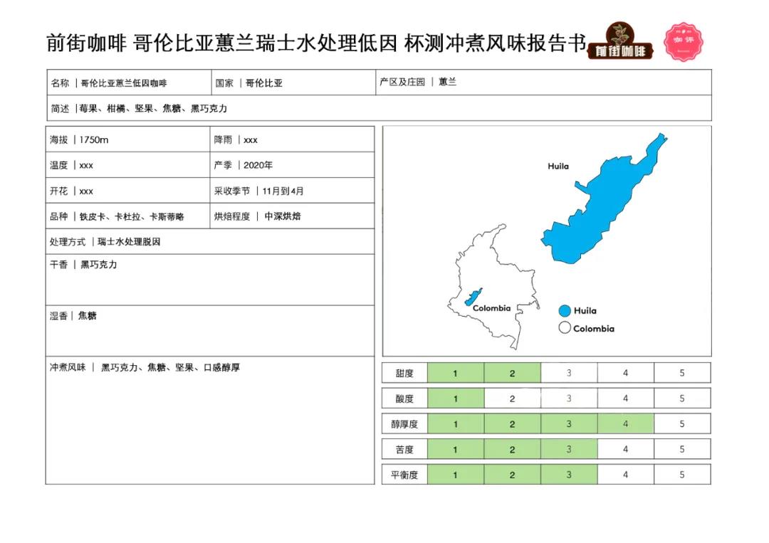 Colombia Huila Swiss Water Process Decaffeinated Coffee Brewing Flavor: Dark chocolate, caramel, nuts, rich body.