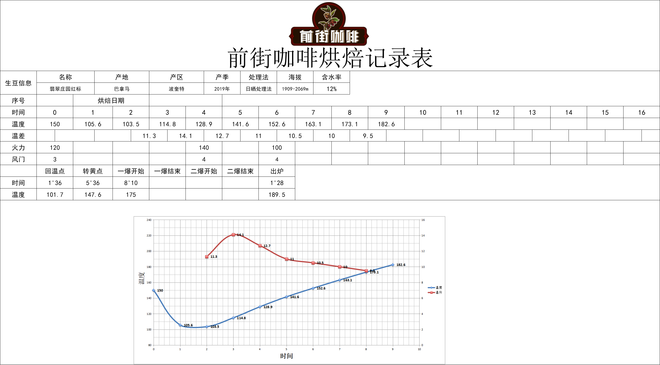 Entry temperature 180°C, yellowing point at 5'20", 151.6°C, first crack at 8'30", 181.8°C, development after first crack for 1'28", discharged at 190°C.