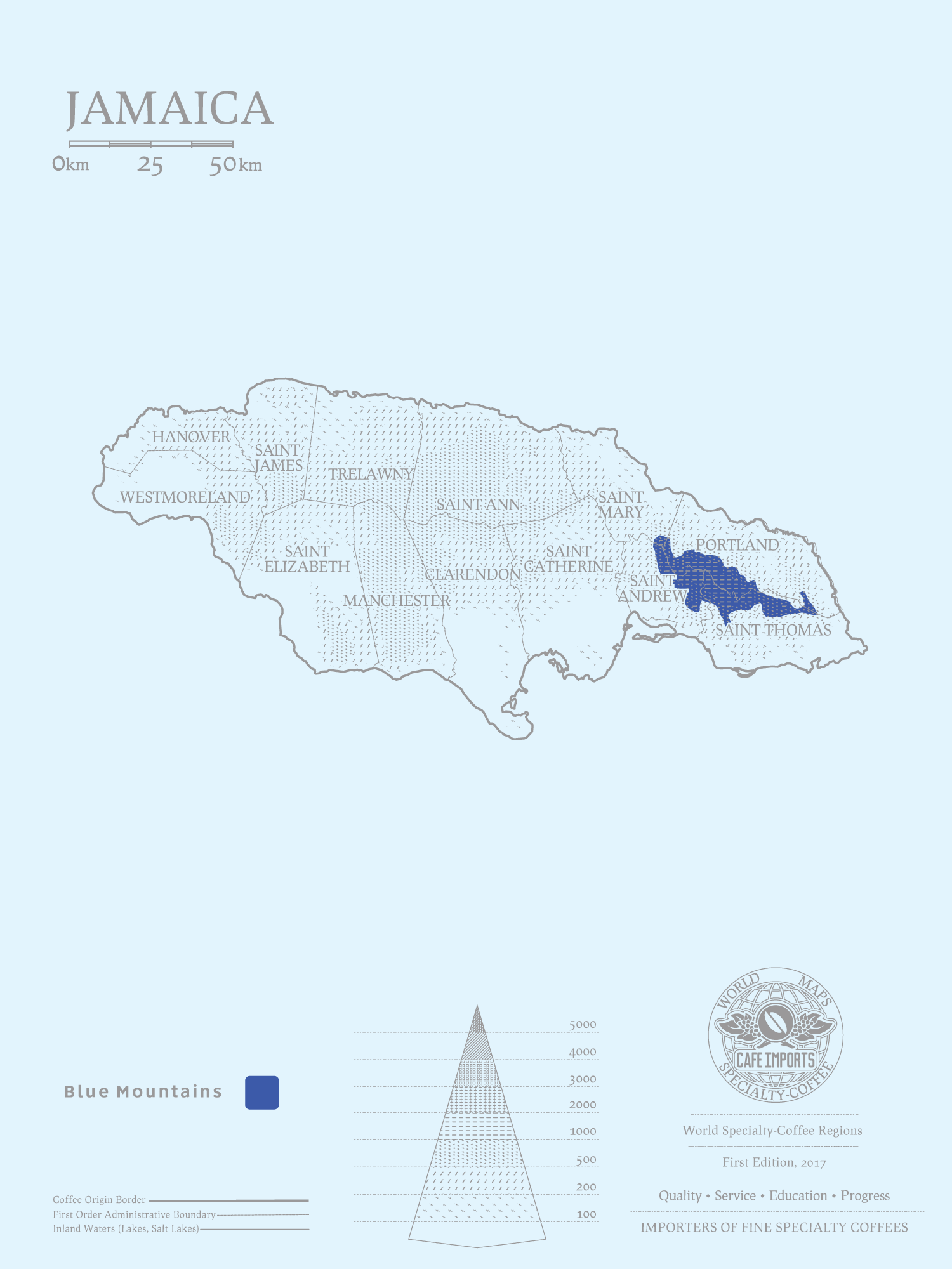 There are four administrative districts certified by the Jamaican Coffee Board as authentic Blue Mountain coffee regions: St. Andrew, St. Thomas, St. Mary, and Portland.