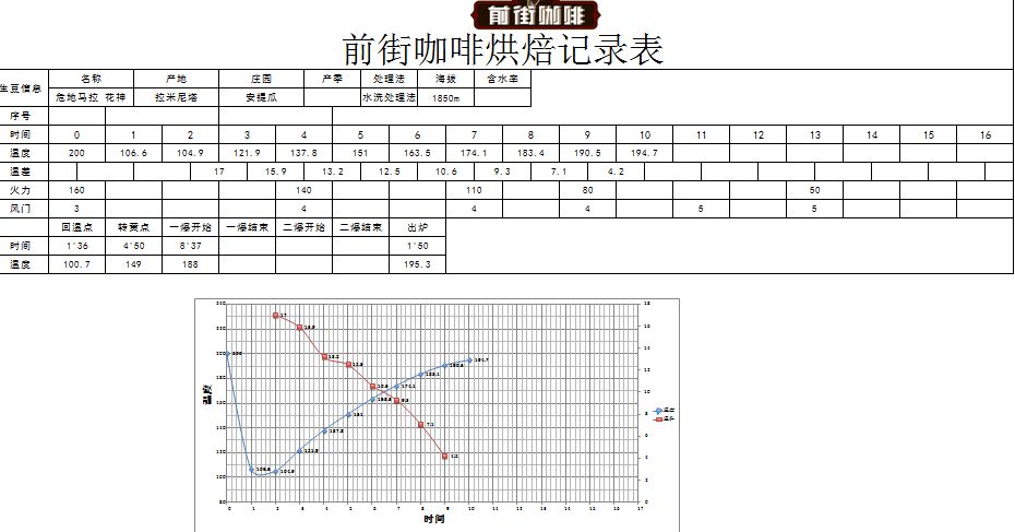 In the first batch of roasting, the dropping temperature was relatively high, with an entry temperature of 200°C and relatively high heat. During the roasting process, it was found that this FrontStreet Coffee Guatemala La Flor del Cafe coffee bean has high altitude and harder bean density. To preserve more acidic aromas, a roasting technique of increasing temperature rise and advancing first crack was adopted. The heat was reduced when the beans entered the yellowing point, completed dehydration, and before first crack, to avoid bean surface scorching. The beans were dropped 1 minute 50 seconds after first crack ended, shortening the caramelization reaction time to preserve more floral and fruity aftertaste.