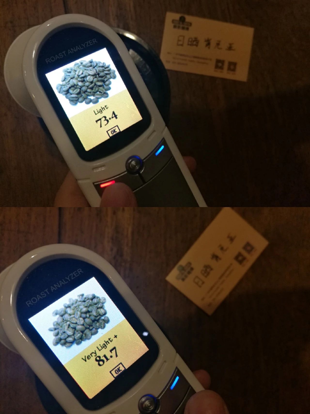 Agtron bean color value 73.4 (above image), Agtron ground color value 81.7 (below image), Roast Delta value is 8.3.