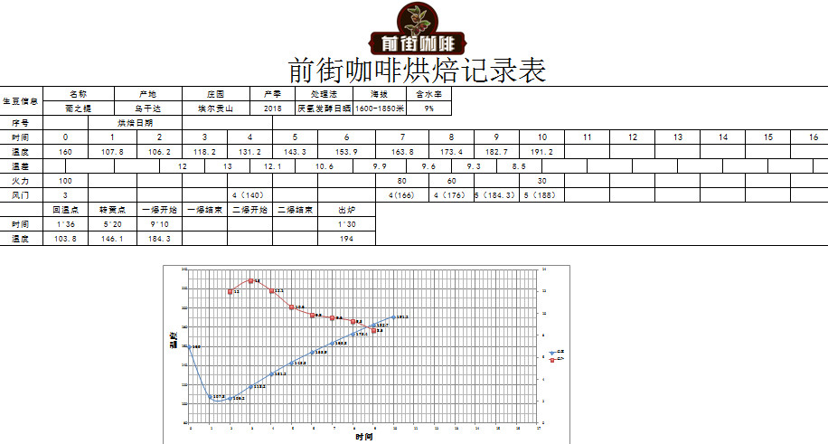 Charge at 160°C with 100 heat power and air damper at 3; turning point at 1'36", when temperature reaches 140°C, open air damper to 4, heat unchanged; when temperature reaches 146.1°C, bean surface turns yellow, grass aroma completely disappears, entering dehydration phase. When temperature reaches 166°C, adjust heat to 80°C, air damper unchanged; at 8'27", bean surface shows ugly wrinkles and black spots, toast aroma clearly transitions to coffee aroma, can be defined as the prelude to first crack. At this point, listen carefully for the first crack sound. First crack starts at 9'10", open air damper to 5. Develop for 1'30 after first crack, discharge at 194°C.