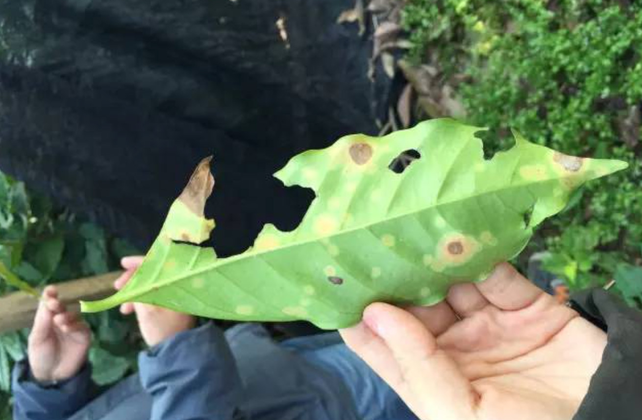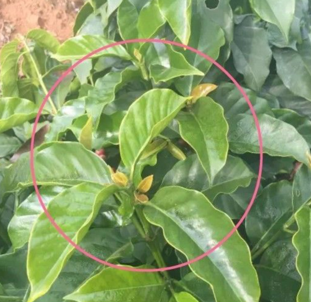 The new leaves at the tips of the branches in the image above are bronze-colored—this is the Typica coffee tree. Typica is an old variety in the Arabica line. The well-known Hawaii Kona is actually also a Typica variety. In a vast field of Catimor, it's actually quite easy to recognize. Typica is one of the oldest varieties of Arabica coffee trees. The top leaves of Typica are bronze-colored, and the beans are elliptical or slender and pointed; the flavor is elegant, but the plant is weak, with poor disease resistance and low fruit yield.