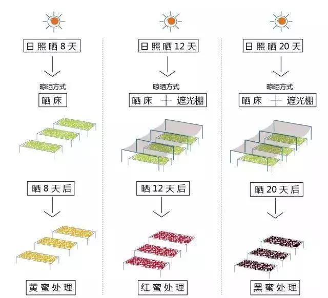 Red honey retains about 75% of the mucilage; compared to yellow honey, the drying time is longer, and direct sunlight exposure time is reduced, even using shade nets, lasting about 12 days.