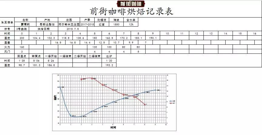 This FrontStreet Coffee Costa Rica Moncherry honey-processed coffee bean has medium size, medium density, and medium bean quality. The new season beans themselves have higher moisture content. During the roasting process, heat absorption is relatively fast, and the Maillard reaction process is also faster. The yellowing point occurs at about 5 minutes. In the first batch of roasting, the drop temperature was relatively high, with an entry temperature of 200°C and relatively high heat setting. During the roasting process, heat was gradually reduced as needed. Heat was fine-tuned when the beans reached the yellowing point, completed dehydration, and showed first crack precursors, avoiding bean surface scorching. Under this operating method, the coffee's dehydration time is relatively shortened, with a temperature increase rate of 6-8°C every thirty seconds, and it enters first crack earlier to preserve clean and bright acidity.