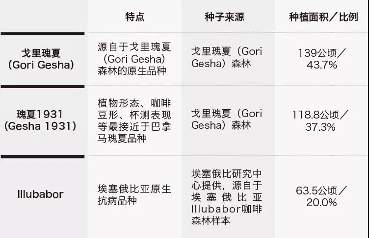 To fulfill the mission of growing the world's best coffee, Gesha Village strictly controls the selection process. They sent coffee seeds collected from the Gori Gesha forest, 20 kilometers away from Gesha Village estate, to professional institutions for genetic testing, confirming this area as the original collection site of the Panama Gesha variety. Subsequently, by studying coffee tree morphology, bean appearance and size, and cupping results, they selected the Gesha variety most similar to today's Panama Gesha and began seedling cultivation. The coffee varieties currently planted in Gesha Village are shown in the figure below: