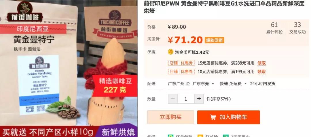 Golden Mandheling 20% off - ¥71.2 for 227g