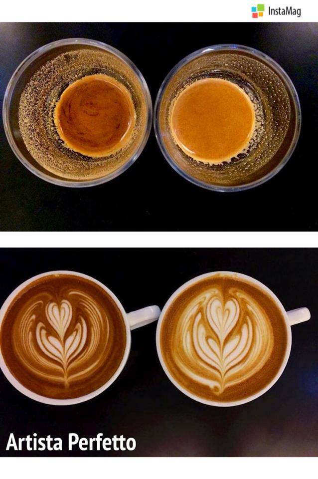 Today, we'll explain the impact of Crema on latte art. In the photo, there are two cups of coffee on the left and right. They use the same milk, coffee amount, and milk foam quality. The only difference is that they use different coffee beans.