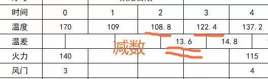 The temperature difference between two time points. For example, between minute 2 and minute 3, there will be a temperature difference. Subtracting the latter (122.4°C) from the former (108.8°C) yields a value (13.6°C).