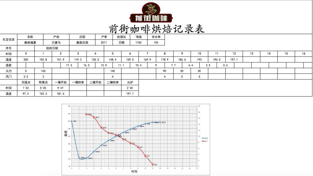 Preheat the roaster to 200°C, set the damper to 3.5, after 30 seconds adjust heat to 160°C, damper to 3, temperature recovery point at 1'32'', adjust heat once at 153.3°C when the bean surface turns yellow and grass aroma completely disappears, dehydration complete, adjust heat to 140°C, damper to 4.