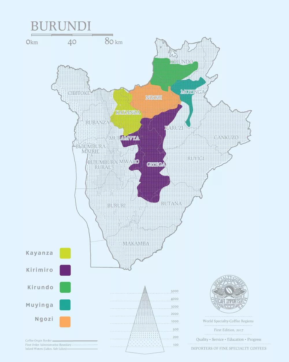 These two regions are in the east and northeast, with elevations around 1,800 meters. Muyinga is closer to the Tanzanian border, but its flavor profile is slightly different from Kayanza's due to milder climate conditions, while Kayanza's acidity is brighter and more varied.