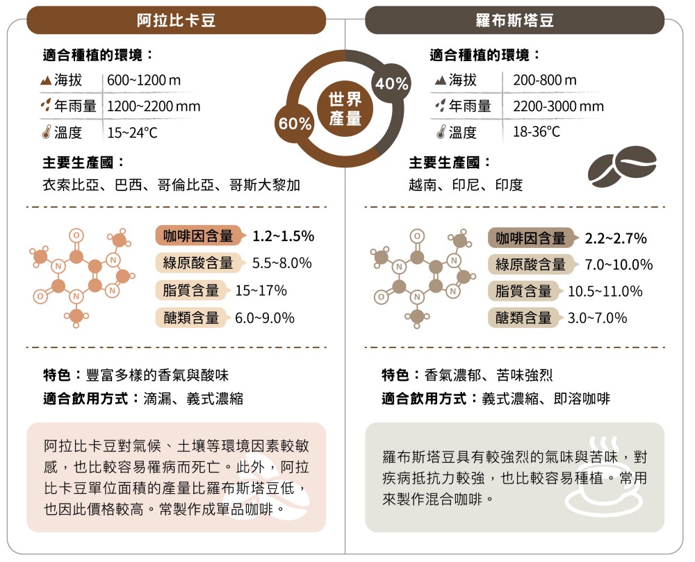 Most of the coffee we commonly encounter in our daily lives comes from Arabica beans (Coffea arabica), which account for about 60% of global production. Because the coffee brewed from them has diverse aromas and rich acidity, they are mostly used to make various specialty coffees.