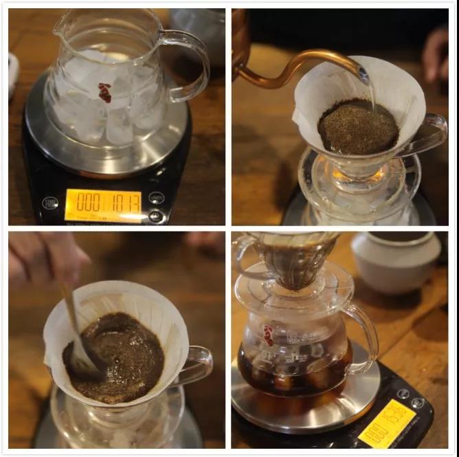 Iced pour-over involves first blooming with hot water, then brewing with iced water. However, since the extraction rate of ice water is relatively low, you need to extend the time to three minutes.