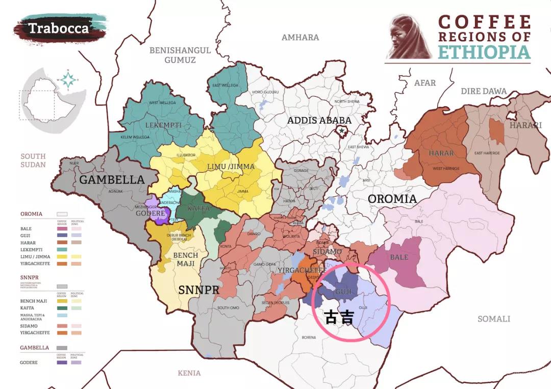 Ethiopia's administrative divisions are organized into four hierarchical levels, from largest to smallest: Region, Zone, Woreda, and Kebele. Most green coffee bean names follow this naming convention. For example, "Huang Kui" (Flower Champion) is located southeast of Yirgacheffe in the Sidamo region. Administratively, it belongs to Oromia Region → Guji Zone → Shakisso Woreda → Hambella.