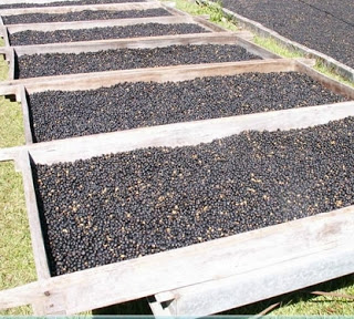 1. After coffee farmers harvest mature red cherries, they are placed directly on drying patios for sun drying;