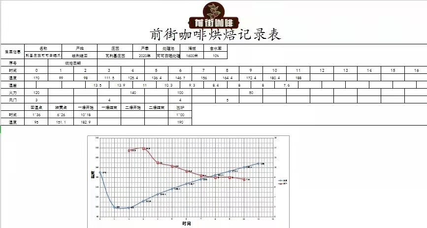 Enter the drum at 170°C, heat at 120, damper opened to 3; Return temperature at 1'36", when drum temperature reaches 111°C, open damper to 4 and adjust heat to 140; At 151.1°C, the bean surface turns yellow, grassy smell completely disappears, entering the dehydration stage. At 7'56", ugly wrinkles and black spots appear on the bean surface, toast smell clearly turns to coffee aroma, which can be defined as the prelude to first crack. Adjust damper to 5. At this time, listen carefully for the sound of first crack. First crack starts at 10'18", develop for 1'00" after first crack, and discharge at 190°C.