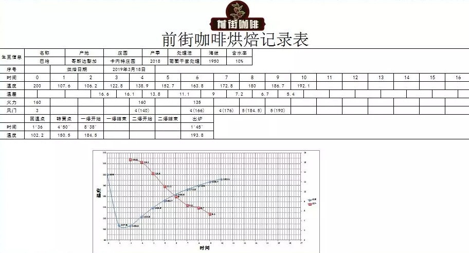 Dehydration complete at 8'15", bean surface shows wrinkles and black spots, toast aroma turns to coffee aroma, as prelude to first crack. At this point, pay attention to listen for the first crack sound. First crack starts at 9'01", damper fully open to 5, heat unchanged. Development time after first crack is 1'45", drop at 193°C.