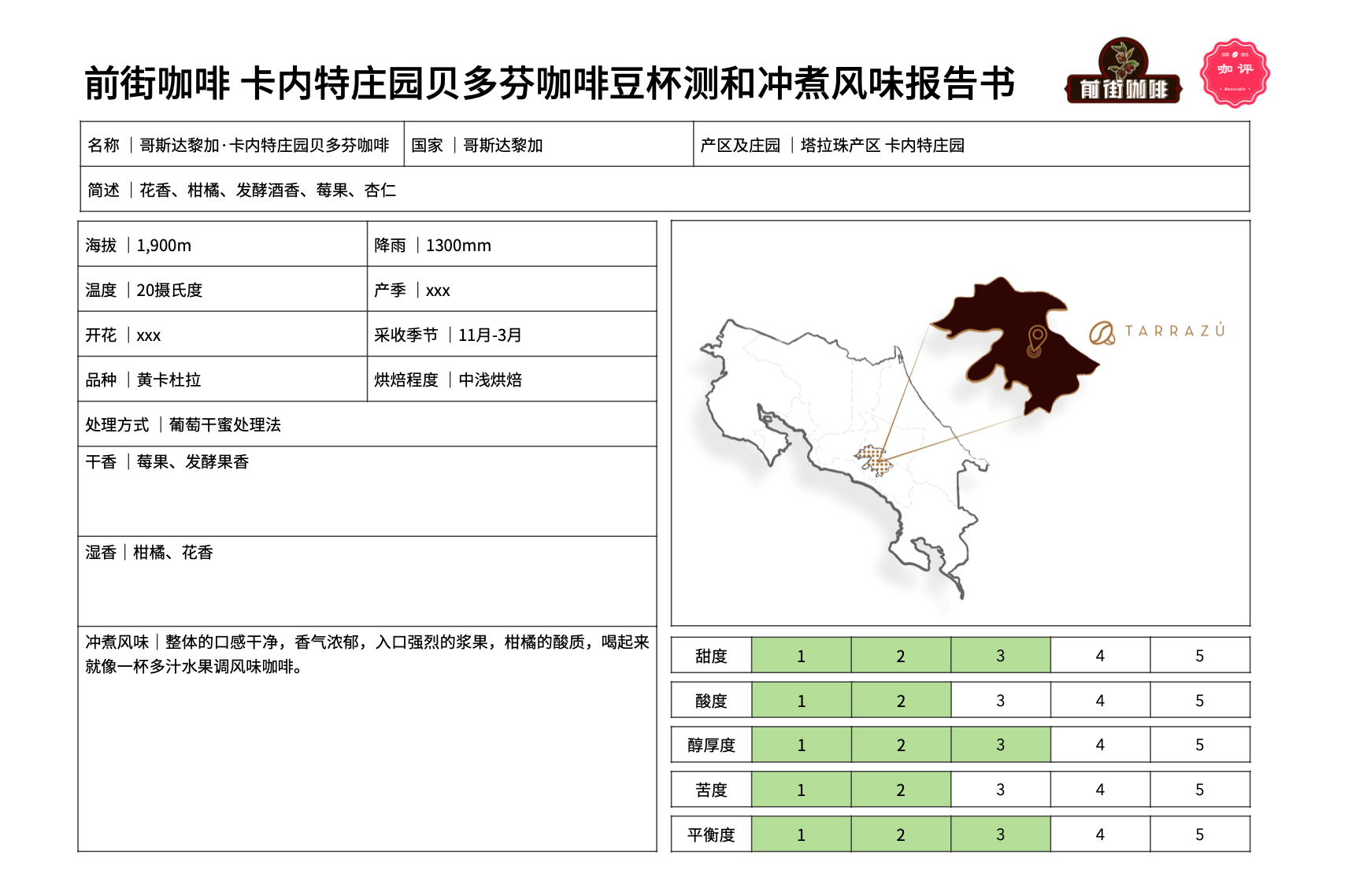 Caturra is a single-gene variant of Bourbon, discovered in Brazil in 1937. It has better production capacity and disease resistance than Bourbon, and the trees are shorter, making harvesting convenient. In terms of taste, it has lemon or citrus acidity and fruit-like sweetness. This area is the most intensive fruit-growing region in Costa Rica. The estate owner primarily grows passion fruit, with coffee quantities being quite scarce. Coffee is only planted in a specific area with special care, and only mature red cherry fruits are picked.