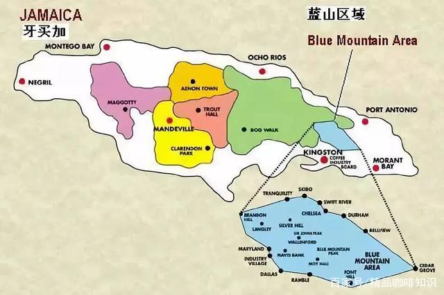 Jamaica is an island in the Caribbean Sea. Jamaica's Blue Mountain is the highest mountain in the western Caribbean (altitude 2256m, with coffee grown only below 1700m, above which is protected forest). Blue Mountain is located in the coffee belt at 25 degrees north latitude, with fertile volcanic soil, fresh air, year-round rainfall, high humidity, large day-night temperature differences, regular rainfall combined with the island's hazy clouds keep coffee trees away from harsh sunlight.