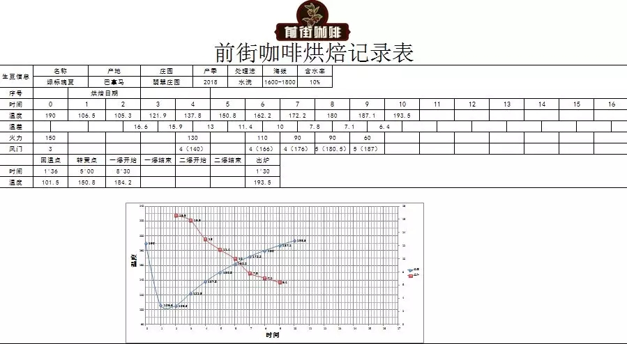 Yellowing point at 5 minutes, first crack began at 8:30 seconds at 184.2°C, with 1:30 seconds of development before dropping at 193.5°C. SCAA roast color value: 66.2 (light-medium roast).