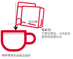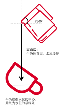 Start with the steel pitcher at a higher position from the cup. Tilt the pitcher at about 60 degrees and let the milk flow out slowly, but not so slow that it drips. Aim the milk at the center of the coffee level, which is the deepest point, so the milk won't surge upward and cover the coffee crema, turning everything white.
