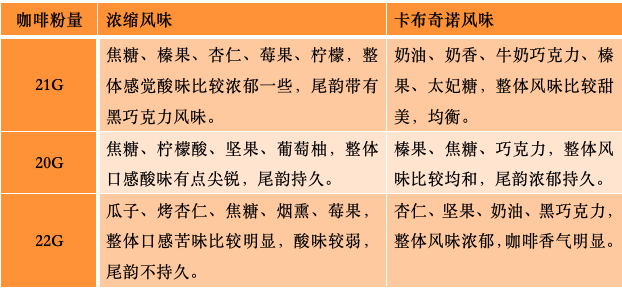 Through this experiment, we can conclude that when increasing the dose, the espresso flavor becomes more intense and full-bodied, with more prominent bitterness, and the coffee flavor remains rich after adding milk; when reducing the dose, the espresso becomes noticeably acidic, though the bitterness is also obvious, but due to its higher extraction yield, it becomes more balanced when made into a cappuccino. Ultimately, the choice of dose for extraction should depend on the coffee flavor profile you want to express!