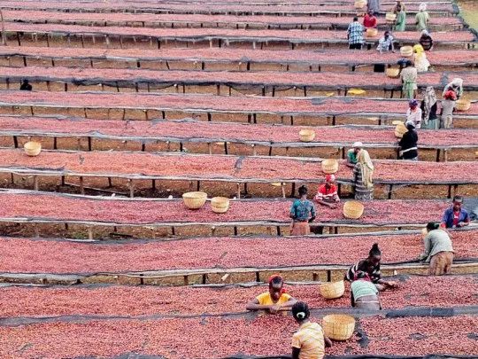1. Coffee farmers place the harvested cherries directly on sun-drying patios to dry in sunlight;