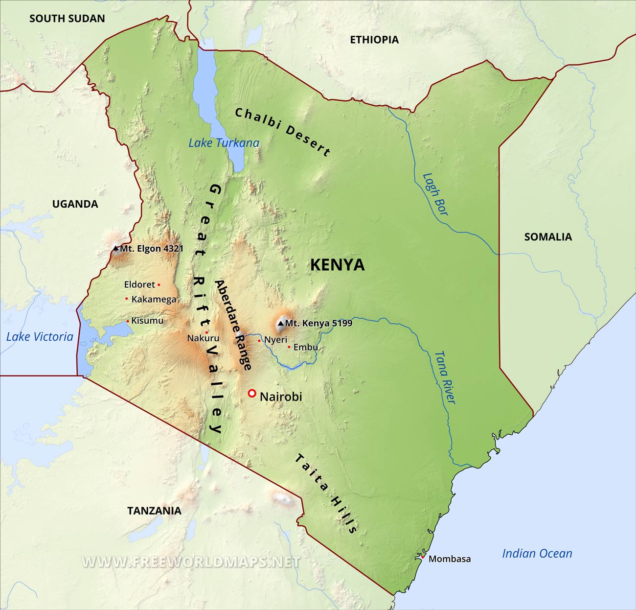 Tanzania covers an area of 945,087 square kilometers, of which Zanzibar covers 2,657 square kilometers. It consists of the mainland, Zanzibar Island, and more than 20 small islands. Located in eastern Africa, south of the equator, the mainland faces the Indian Ocean to the east, connects to Zambia, Malawi, and Mozambique to the south, borders Rwanda, Burundi, and Congo (DRC) to the west, and is bounded by Kenya and Uganda to the north. The mainland coastline is 840 kilometers long. Tanzania's terrain is high in the northwest and low in the southeast, presenting a step-like shape. The eastern coast is lowland, while the western inland plateau accounts for more than half of the inland area. The East African Rift Valley runs north-south from Lake Malawi, dividing into eastern and western branches. Kibo Peak of Mount Kilimanjaro in the northeast has an altitude of 5,895 meters, the highest peak in Africa.