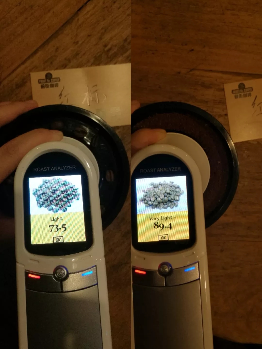 Agtron bean color value: 73.5 (left image). Agtron ground color value: 89.4 (right image). Roast Delta: 15.9.