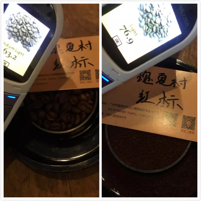 Agtron bean color value: 63.2 (left image). Agtron ground color value: 76.9 (right image). Roast Delta: 13.7.