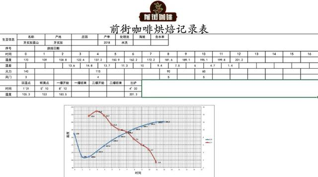 Roasting curve: Heat the drum to 170°C and add beans, open the damper to 3. After 1 minute, adjust heat to 140°C, damper unchanged. Roast until 5'10", temperature reaches 153°C, bean surface turns yellow, grassy aroma completely disappears, dehydration complete. Adjust heat to 115°C, damper to 4. At 8'00", ugly wrinkles and black spots appear on bean surface, toast aroma明显 transitions to coffee aroma, which can be defined as the prelude to first crack. At this point, listen carefully for the sound of first crack. At 8'12", first crack begins, reduce heat to 90°C, damper fully open (adjust heat very carefully, not so low that crackling stops). Remove beans at 201.3°C.