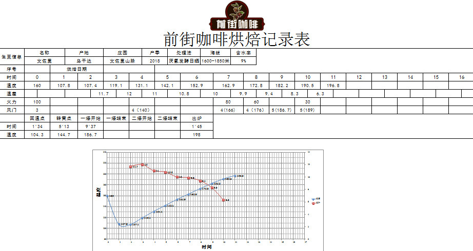 Charge into the drum at 160℃, heat at 100%, damper opened to 3; Return temperature at 1'34", when drum temperature reaches 140℃, open damper to 4, heat unchanged; When drum temperature reaches 144.7℃, the bean surface turns yellow, grass smell completely disappears, entering the dehydration stage. When drum temperature reaches 166℃, adjust heat to 80, damper unchanged; At 8'46", ugly wrinkles and black spots appear on the bean surface, toast smell clearly turns to coffee aroma, which can be defined as the prelude to first crack. At this time, listen carefully for the sound of first crack. At 9'37", first crack begins, open damper to 5, develop for 1'45" after first crack, discharge at 198℃.