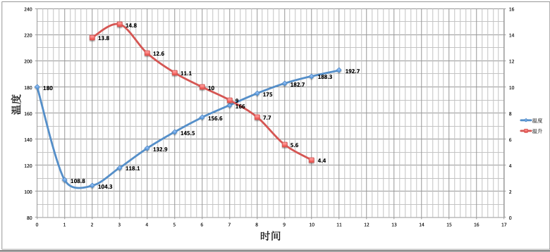 Charge temperature: 180°C, heat: 125, damper: 3; Return point at 1'39", when furnace temperature reached 140°C, damper adjusted to 3.5, heat adjusted to 100; when furnace temperature reached 151.2°C, bean surface turned yellow, grassy smell completely disappeared, entering dehydration stage. When furnace temperature reached 156°C, heat adjusted to 80, damper unchanged; when furnace temperature reached 166°C, heat adjusted to 50, damper unchanged. After first crack, damper adjusted to 5.