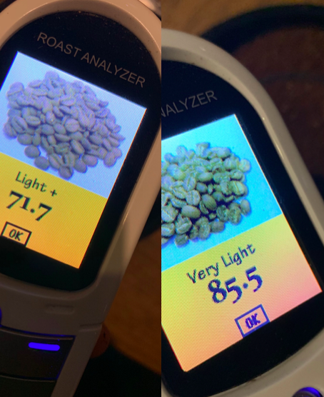 Agtron bean color value is 71.7 (left image), Agtron powder color value is 85.5 (right image), Roast Delta value is 13.8.