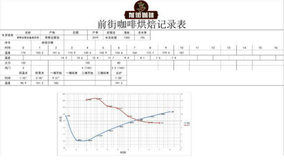 Enter beans at 175°C, heat at 120, damper at 3; return to temperature point at 1'42" at 98.9°C; when the roaster temperature reaches 140°C, open the damper to 4, heat unchanged; when the roaster temperature reaches 151.2°C, the bean surface turns yellow, grassy smell completely disappears, entering the dehydration stage; when the roaster temperature reaches 166°C, adjust heat to 110°C, damper at 4; when the roaster temperature reaches 183.3°C, heat unchanged, open damper to 5; when the roaster temperature reaches 188°C, reduce heat to 50, damper unchanged.