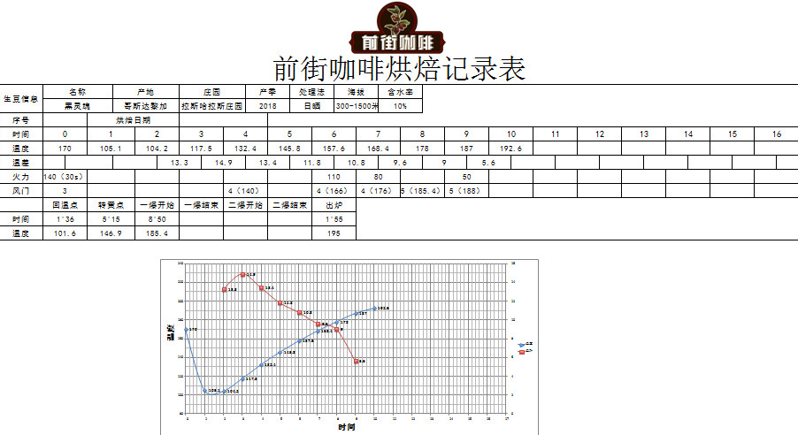 Dehydration completes at 8'07", with wrinkles and black spots appearing on the bean surface. The toasted bread aroma transforms into coffee aroma, signaling the prelude to first crack. At this point, pay attention to listen for the first crack sound. First crack begins at 8'50", with the damper fully opened to 5 and heat unchanged. The development time after first crack is 1'55", with the beans discharged at 195°C.
