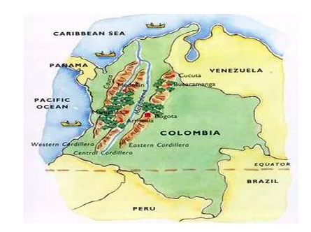 Located in the northwestern part of the South American continent, Colombia borders Panama in Central America. From an aerial view, its western side appears as if scratched by a cat's paw, leaving three vertical claw marks from north to south. The country's famous coffee-growing regions are scattered throughout these Andes Mountains with fertile volcanic soil.