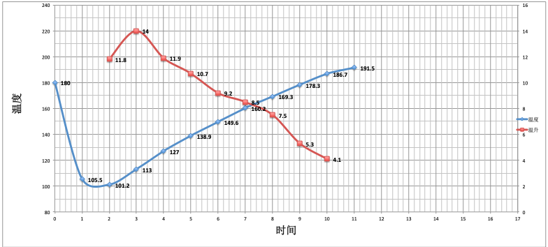 Heat the drum to 180°C and add beans, with damper at 3 and heat at 120. Return temperature at 1'42", when drum temperature reaches 140°C, maintain heat unchanged, open damper to 4. At this point, the bean surface turns yellow, grassy smell completely disappears, entering the dehydration stage. When temperature reaches 176°C, reduce heat to 100, when temperature reaches 180°C, reduce heat to 70, damper remains unchanged.
