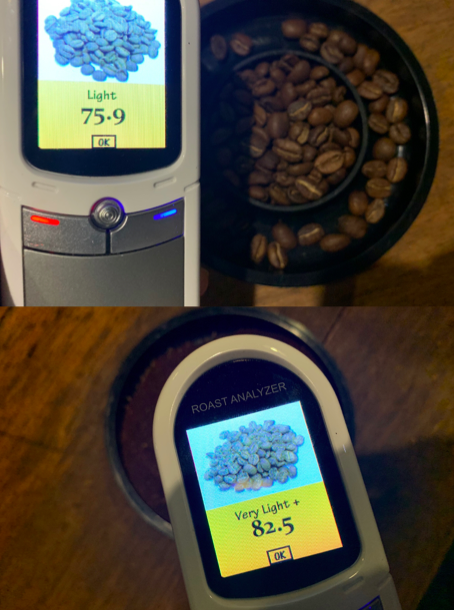 Agtron bean color value 75.9 (above image), Agtron ground color value (below image) 82.5, Roast Delta value 6.6.