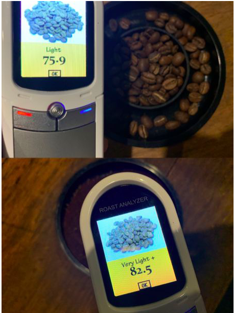 Agtron bean color value 75.9 (above image), Agtron ground color value (below image) 82.5, Roast Delta value 6.6.