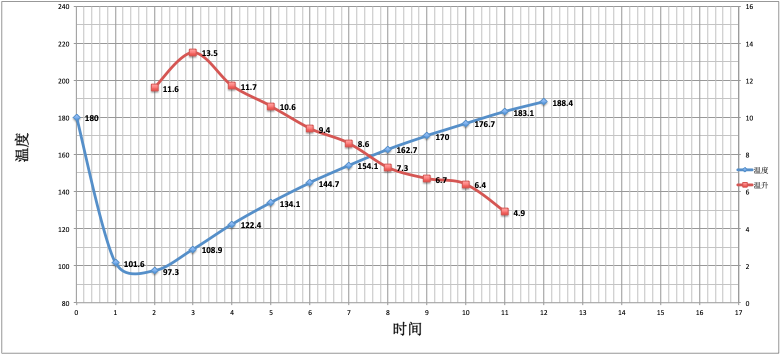 Charge at 180°C with damper at 3 and heat at 100. Return temperature at 1'43", maintain heat at 140°C with damper at 4. At this point, the bean surface turns yellow, grassy aroma completely disappears, entering the dehydration phase. At 151°C, reduce heat to 80, and at 166°C, reduce heat to 65, keeping damper unchanged.